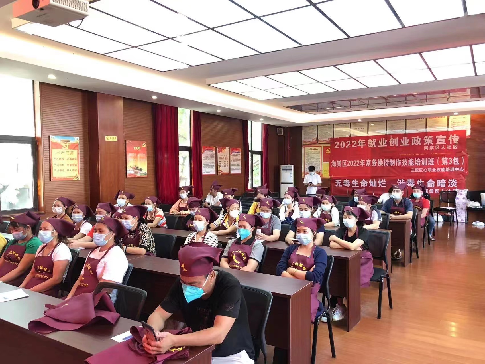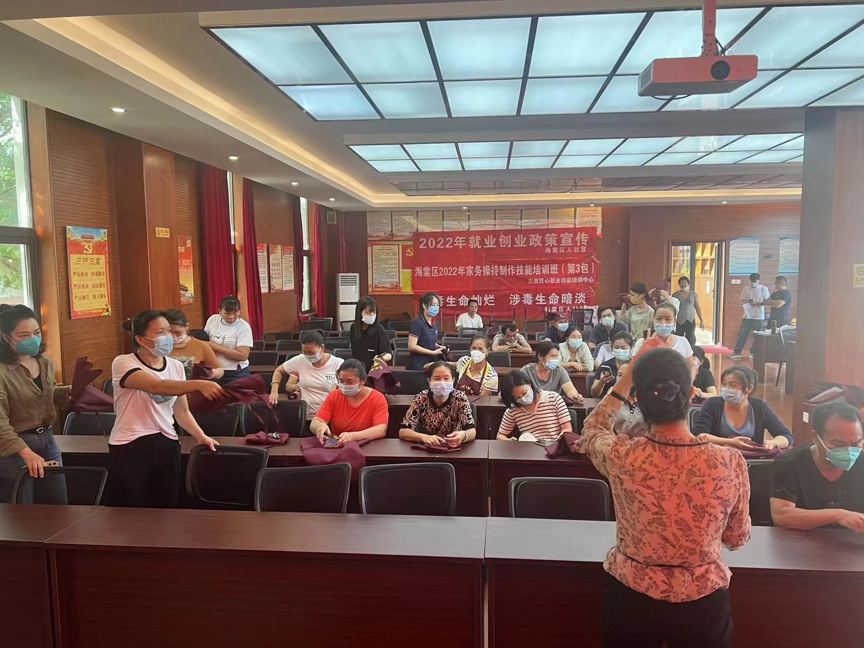 三亞匠心職業(yè)技能培訓中心在開(kāi)班儀式上為各位學(xué)員精心準備了配套的培訓服,學(xué)員按照防疫要求,依次掃碼測體溫進(jìn)場(chǎng)并領(lǐng)取服裝。出席此次開(kāi)班儀式的有三亞匠心職業(yè)技能培訓中心總經(jīng)理康小燕,以及海棠區人社局、海棠區江林村居委會(huì )相關(guān)領(lǐng)導。